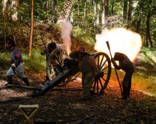 Night firing of a cannon is a really special event. The images have a totally different look and feel to them. For the night firings, I use tripod, because I am also using longer shutter speeds. I have found around 2.5 seconds is good. The ball of flames acts as a flash would and will light up the cannon crew and part of the area around the cannon.
