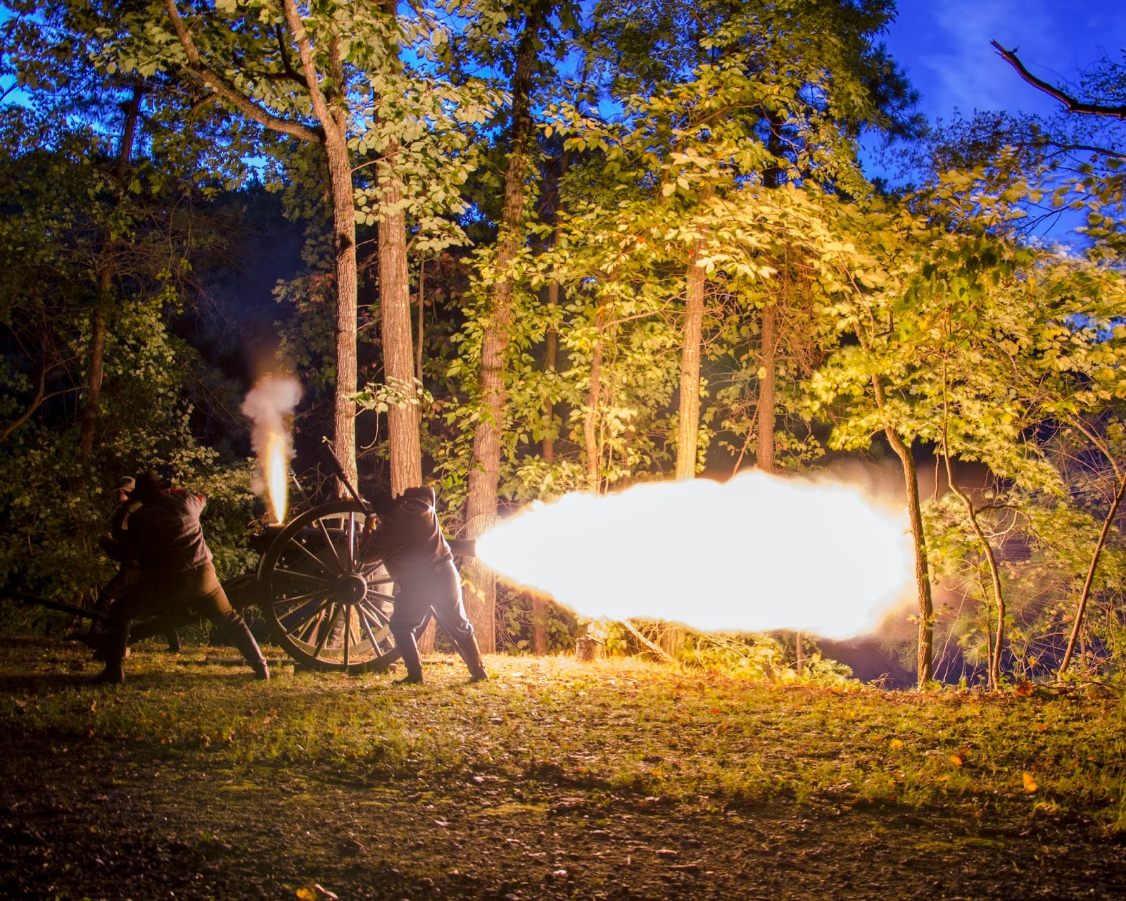 Night firing of a cannon is a really special event. The images have a totally different look and feel to them. For the night firings, I use tripod, because I am also using longer shutter speeds. I have found around 2.5 seconds is good. The ball of flames acts as a flash would and will light up the cannon crew and part of the area around the cannon.