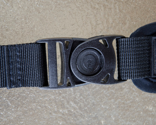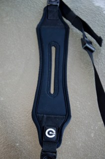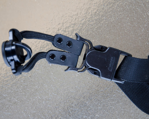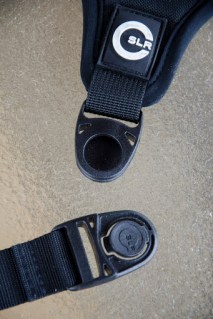 The strap also has a heavy duty squeeze buckle that allows you to remove the camera from the strap without removing the c-loop. There are also two swiveling clip style buckles that attach the strap ends to the shoulder pad. This allows the strap to move with you as you move as well as self adjust to different body types.