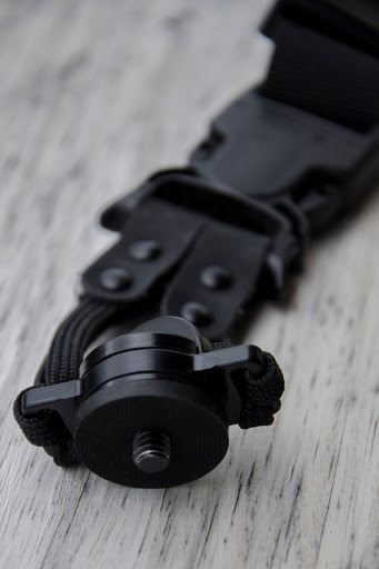 The “C-Loop” is the attachment point for using the tripod socket on the bottom of the camera. The genius design allows it to swivel as you walk and move around, which prevents it from unscrewing from the camera and eliminating the need to have an extra retention strap like some other brands of straps have. I have spent full eight hour days wearing the strap with the camera and have never had it work loose. The “C-Loop” has a small pop up thumb grip so you can attach the strap to the camera without any tools. It also has a heavy duty rubber gasket that also adds pressure and aids in preventing it from unscrewing.