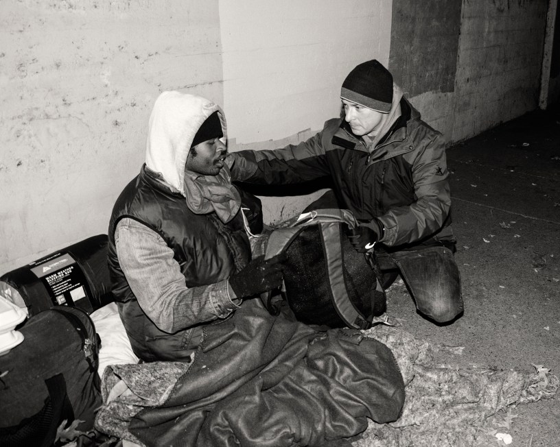 It’s so much more than just handing out coats and backpacks to people in need. We do our best to make contact with them and make a connection of some sort. We have conversations with our fellow humans and we are compassionate towards those who are less fortunate. The image above brought it all home for me. It shows exactly what we do. Larry listens to the man tell his story about how he got to where he is on the street. It’s so much more meaningful to have a connection and a conversation than just handing out coats and backpacks.